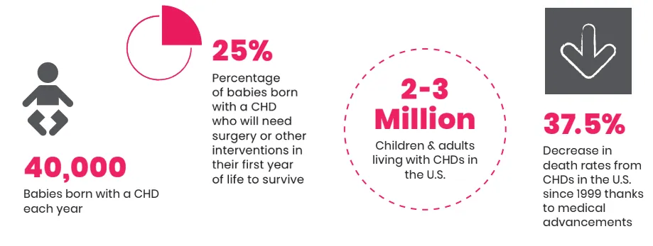 CHDs are America’s most common birth defect, affecting nearly 40,000 babies each year in the U.S alone. This equates to 1 child every 15 minutes. Click here for more CHD facts and statistics.